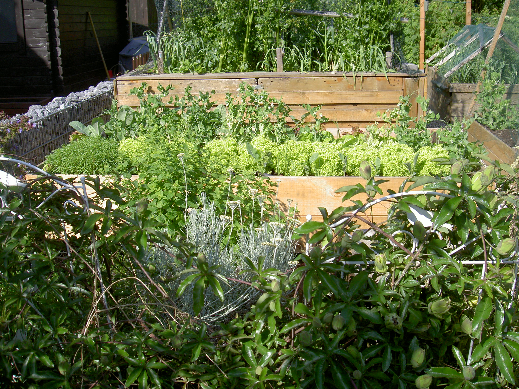 Der Garten hat ca. 400 qm. Ein Hausgarten mit Gewächshaus, Hochbeeten, einem kleinen Teich, Bienen. Kleine Obstbäume und Pfingstrosen erfreuen das Auge.
