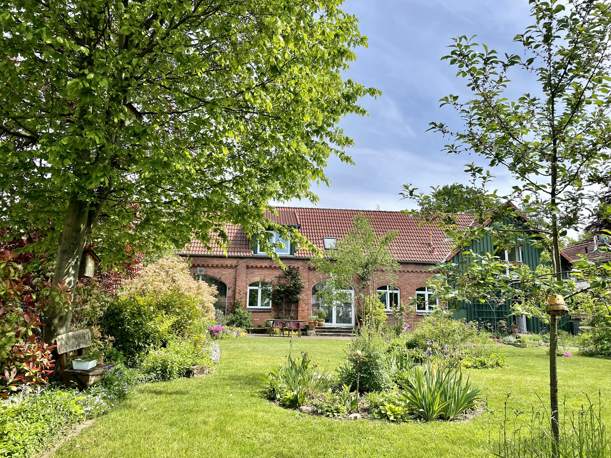 Großer vielfältiger Garten (1900qm) mit insekten- freundlicher Gestaltung. Es gibt Stauden, Kräuter, Obstbäume und Gemüse. Auch fünf Hühner und viele Bienen fühlen sich wohl. Bei einer Tasse Tee oder Kaffee kann der eigene Honig gerne probiert werden. Platz für Kinder zum Spielen und Toben ist auch vorhanden.