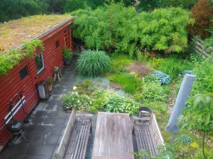 Kastanie, Frühblühern, Stauden, Rosen und Obst. Ein zweiter Teil hinter dem Haus mit Bambus, Funkien und Farnen. Raum für Insekten, Vögel und Sitzgelegenheiten. Dazu noch Bienen und ein Glashaus mit Kakteen.