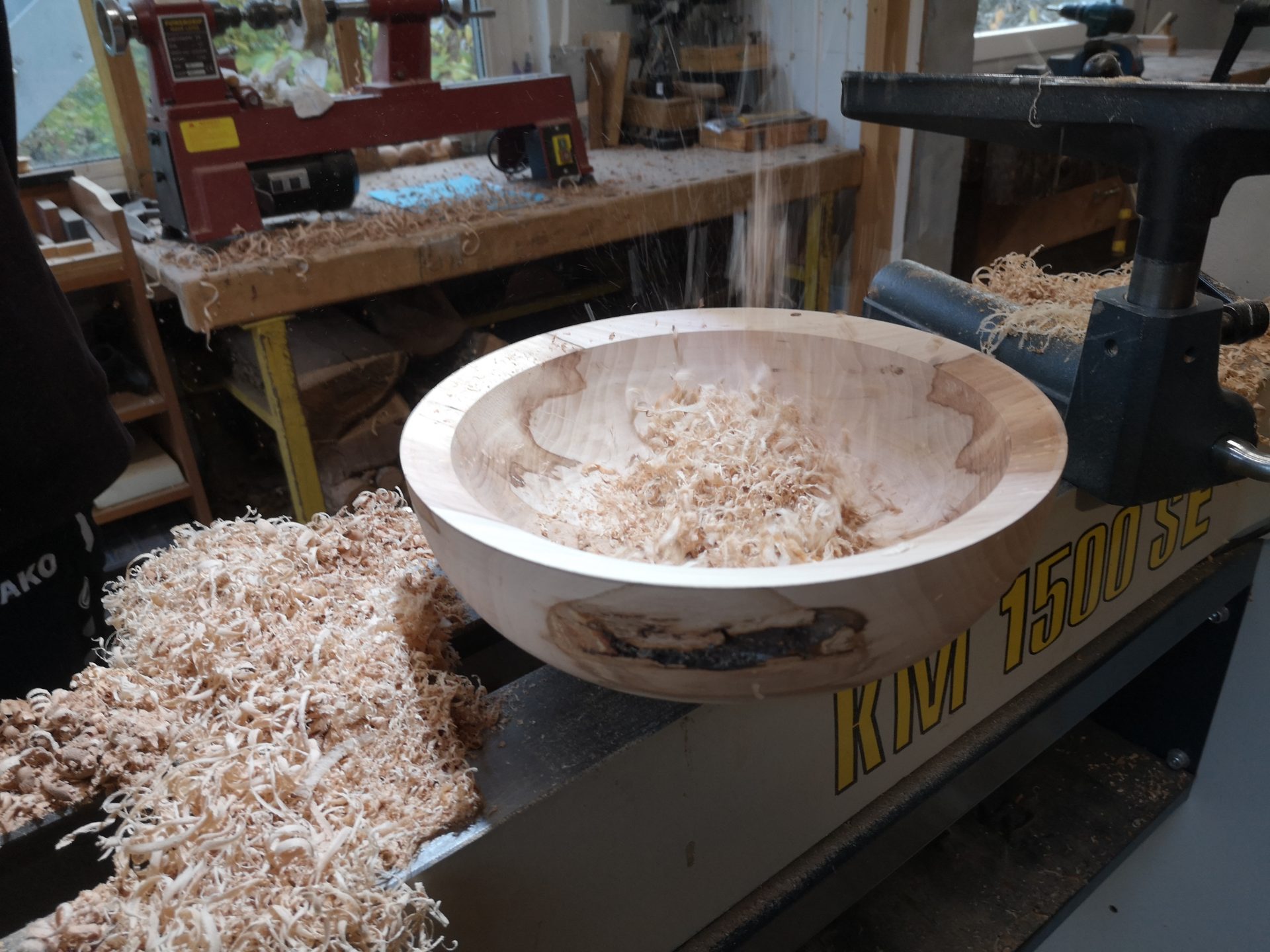 Detlev dreht Gebrauchsgegenstände oder auch kleine Skulpturen aus Holz.