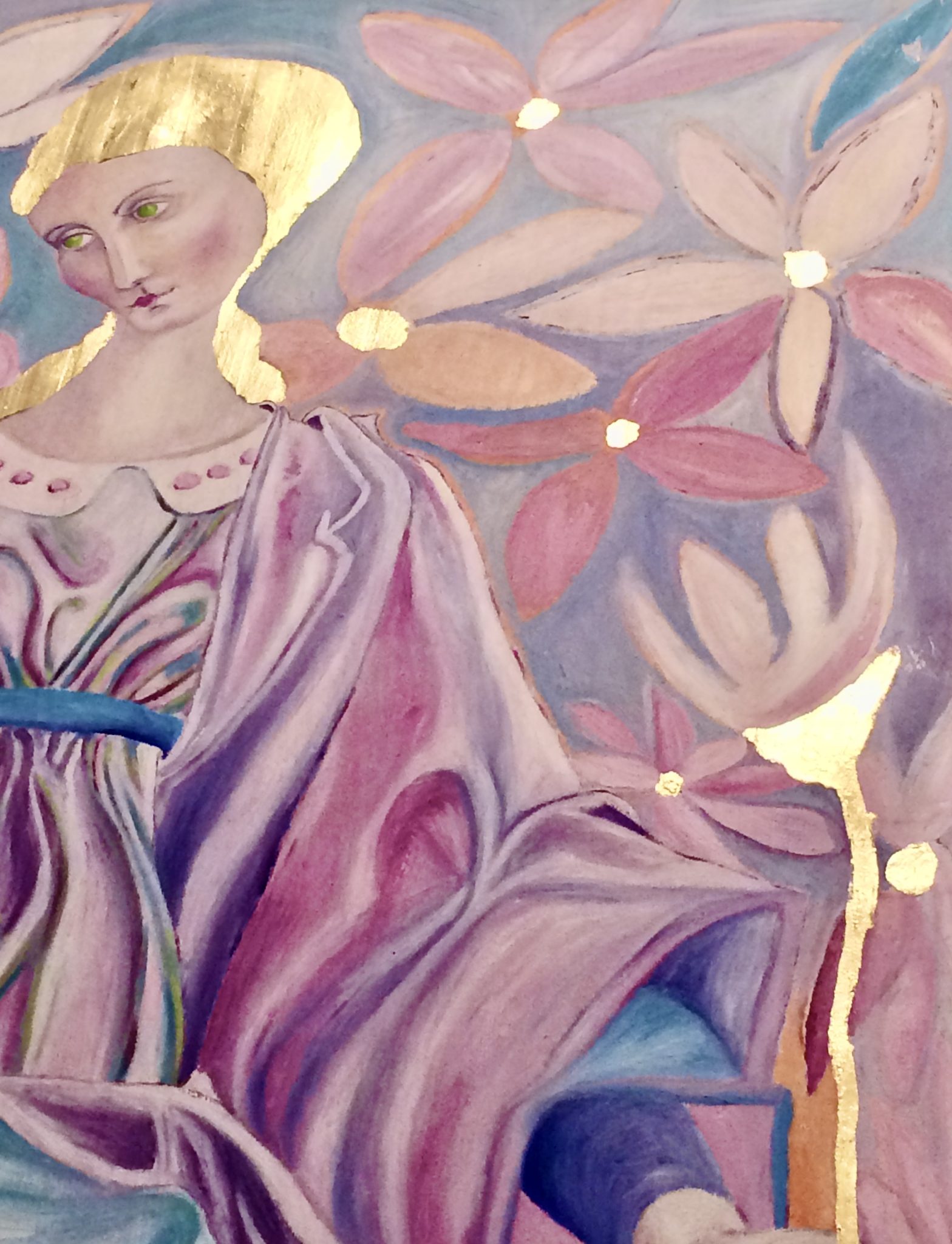 Mirja verwendet Öl, Acryl und Kreide/Wachs auf Leinwand sowie Tempera auf Kreidegrund. Vergoldet werden nicht nur die Ikonen sondern auch fast alle anderen Bilder.